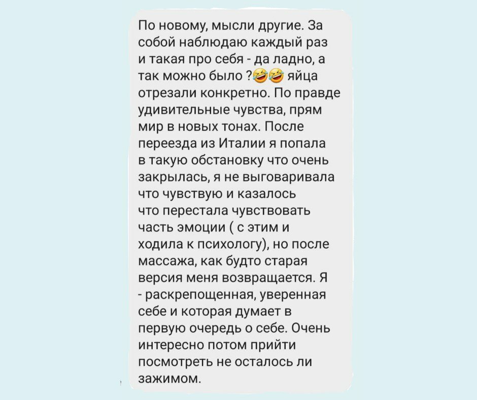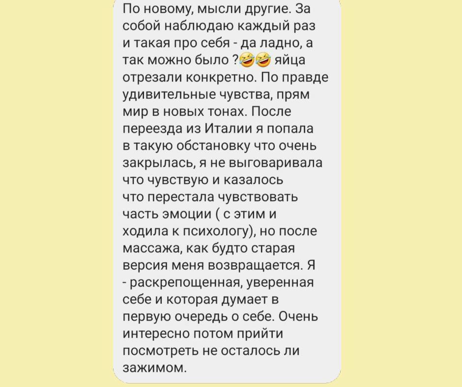 Після масажу клієнт не лише відчуває себе краще фізично, але й отримує новий рівень внутрішньої легкості та спокою, що робить життя яскравішим і гармонійнішим.