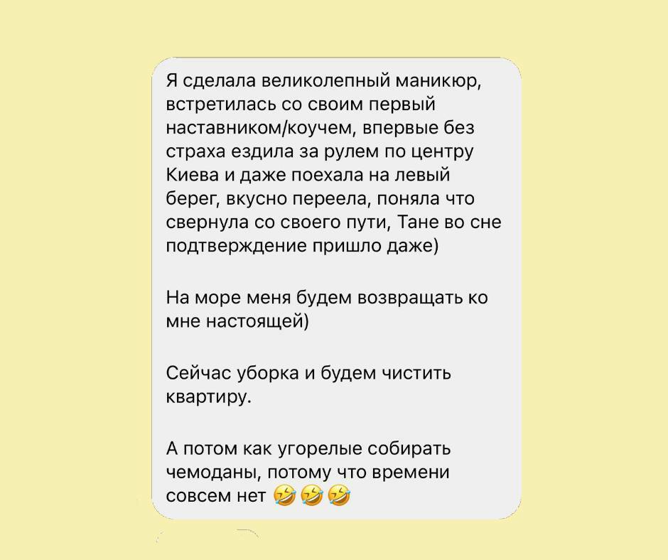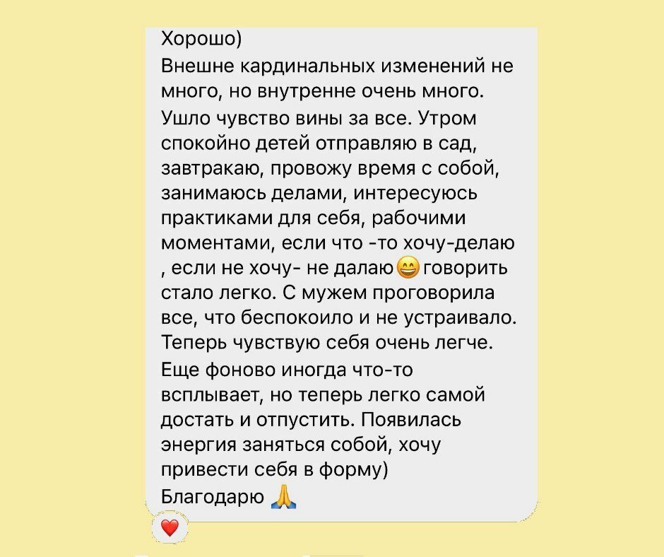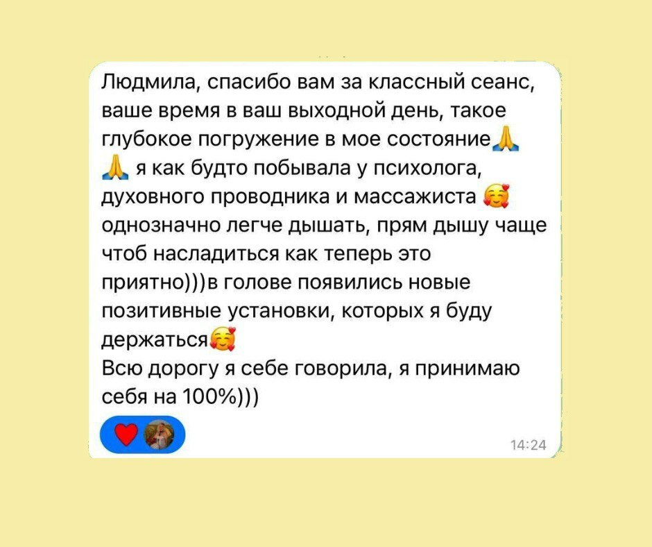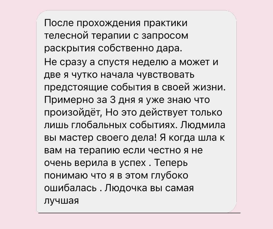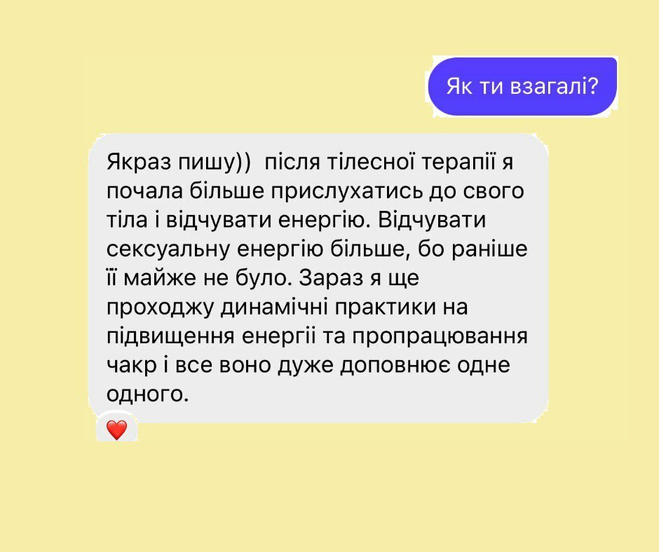 Магію та чародійство не обіцяю, але іноді і таке теж буває. Тілесна терапія - це праця майстра та клієнта, я як майстер підказую, направляю, а ви з довірою та відповідальностю працюєте і як результат - маєте легкість та свободу, енергія відновиться, з'явиться бажання жити, ви зможете позбутися блоків у тілі і підсвідомості, невдалих родових сценарієв, ви почнети розуміти, що відбувається в вашому тілі, навчитеся справлятися з емоціями, зрозумієте як почуття впливають на ваше тіло, зможете покращити здоровья та самопочуття в цілому.
