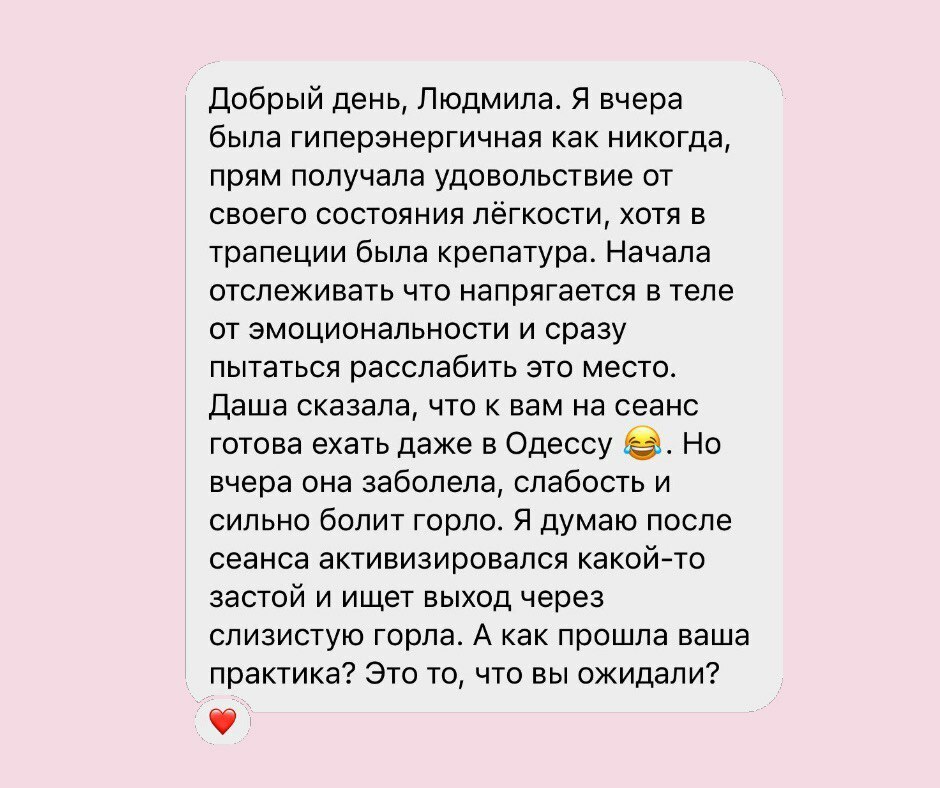 Після сесії клієнтка відчуває полегшення, наповненість енергією, спокій та гармонію. Саме так вісцеральна терапія допомагає відновити не лише фізичний стан, а й глибокий внутрішній баланс.